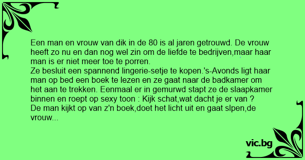 Ze besluit een spannend lingerie-setje te kopen.'s-Avonds ligt haar man op bed een boek te lezen en ze gaat naar de badkamer om het aan te trekken. Eenmaal er in gemurwd stapt ze de slaapkamer binnen en roept op sеxy toon : Kijk schat,wat dacht je er van ?