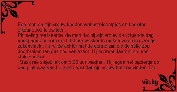 "Maak me alsjeblieft om 5.00 uur wakker". Hij legde het papiertje op een plek waarvan hij zeker wist dat zijn vrouw het zou vinden. De volgende ochtend werd de man wakker en kwam tot de ontdekking dat het al 9.00 uur was en dat hij dus zijn vlucht gemist had. Hij was woedend en stond op het punt om op zoek te gaan naar zijn vrouw om er achter te komen waarom ze hem niet had gewekt. Ineens zag hij een papiertje bij het bed liggen.
