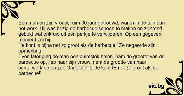 Even later ging de man een duimstok halen, nam de grootte van de barbecue op, liep naar zijn vrouw, nam de grootte van haar achterwerk op en zei: Ongelofelijk. Je kont IS net zo groot als de barbecue!' Maar ze negeerde ook deze opmerking.