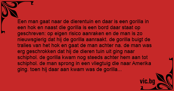 Een man gaat naar de dierentuin en daar is een gorilla in een hok en naast die gorilla is een bord daar staat op geschreven: op eigen risico aanraken en de man is zo nieuwsgierig dat hij de gorilla aanraakt. de gorilla buigt de tralies van het hok en gaat de man achter na. de man was erg geschrokken dat hij de dieren tuin uit ging naar schiphol. de gorilla kwam nog steeds achter hem aan tot schiphol. de man sprong in een vliegtuig die naar Amerika ging. toen hij daar aan kwam was de gorilla nog steeds achter hem hij ron naar de dichtbijzijnde hotel en viel van moeheid op de bed maar de gorilla was nog steeds achter hem en kwam bij zijn bed en raakte hem aan en zij:tikkie jij веnт em!!!!!!!