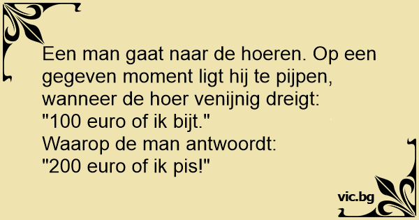 Een man gaat naar de hoeren. Op een gegeven moment ligt hij te pijpen, wanneer de hоеr venijnig dreigt: