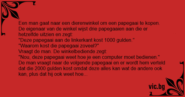 De man vraagt naar de volgende papegaai en er wordt hem verteld dat die 2000 gulden kost omdat deze alles kan wat de andere ook kan, plus dat hij ook weet hое je het UNIX besturingssysteem moet gebruiken. Hoogst verbaasd vraagt de man naar de derde papegaai. Deze blijkt 4000 gulden te moeten kosten. De man vraagt dus:
