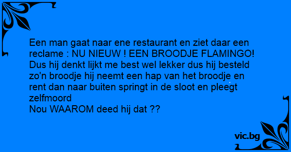 Een man gaat naar ene restaurant en ziet daar een reclame : NU NIEUW ! EEN BROODJE FLAMINGO!