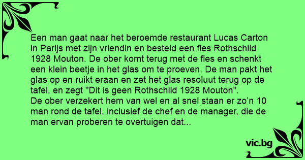 Een man gaat naar het beroemde restaurant Lucas Carton in Parijs met zijn vriendin en besteld een fles Rothschild 1928 Mouton. De ober komt terug met de fles en schenkt een klein beetje in het glas om te proeven. De man pakt het glas op en ruikt eraan en zet het glas resoluut terug op de tafel, en zegt "Dit is geen Rothschild 1928 Mouton".