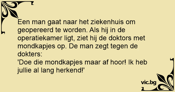Een man gaat naar het ziekenhuis om geopereerd te worden. Als hij in de operatiekamer ligt, ziet hij de doktors met mondkapjes op. De man zegt tegen de dokters: