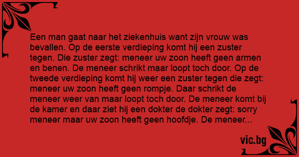 Een man gaat naar het ziekenhuis want zijn vrouw was bevallen. Op de eerste verdieping komt hij een zuster tegen. Die zuster zegt: meneer uw zoon heeft geen armen en benen. De meneer schrikt maar loopt toch door. Op de tweede verdieping komt hij weer een zuster tegen die zegt: meneer uw zoon heeft geen rompje. Daar schrikt de meneer weer van maar loopt toch door. De meneer komt bij de kamer en daar ziet hij een dokter de dokter zegt: sorry meneer maar uw zoon heeft geen hoofdje. De meneer schrikt weer maar gaat toch naar binnen. Daar ziet hij een oortje liggen. De meneer zegt: het maakt niet uit dat jij geen armen, benen, rompje en hoofdje hebt je blijft altijd mijn zoon ik blijf altijd van je houden. Komt de dokter binnen: meneer doe geen moeite het oortje is doof.