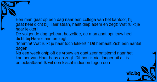 Een man komt elke dag op kantoor, wandelt naar een vrouwelijke collega toe, gaat dichtbij haar staan, ruikt eens goed en zegt haar dat haar haren lekker ruiken.. Na een week waarbij die man dat...