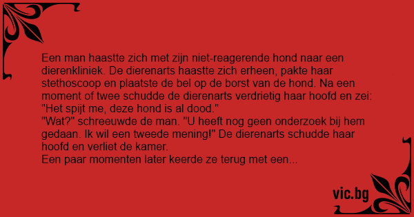 Een man haastte zich met zijn niet-reagerende hond naar een dierenkliniek. De dierenarts haastte zich erheen, pakte haar stethoscoop en plaatste de bel op de borst van de hond. Na een moment of twee schudde de dierenarts verdrietig haar hoofd en zei: