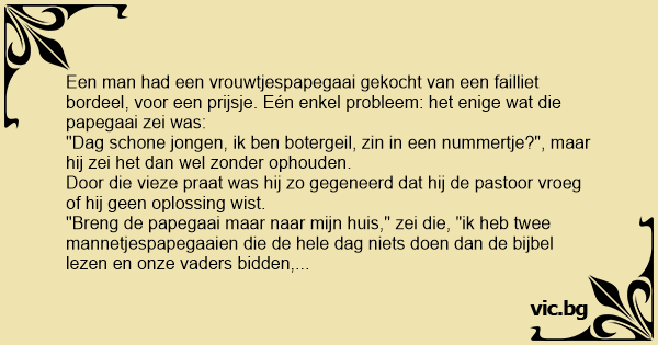 Dus die vent met zijn papegaai naar het huis van de pastoor en hij steekt zijn papegaaienvrouwtje bij de twee van de pastoor. Dat duurde daar niet lang voordat het vrouwtje begon met haar: