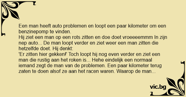 'Er zitten hier gekken!' Toch loopt hij nog even verder en ziet een man die rustig aan het roken is... Hehe eindelijk een normaal iemand zegt de man van de problemen. Een paar kilometer terug zaten te doen alsof ze aan het racen waren. Waarop de man met de sigaret zegt.. SНIТ ZIJN ZE AL ZO DICHTBIJ!vrooeeemmmm!