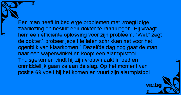 Een man heeft in bed erge problemen met vroegtijdige zaadlozing en besluit een dokter te raadplegen. Hij vraagt hem een efficiënte oplossing voor zijn probleem. “Wel,” zegt de dokter,” probeer jezelf te laten schrikken net voor het ogenblik van klaarkomen.” Dezelfde dag nog gaat de man naar een wapenwinkel en koopt een alarmpistool. Thuisgekomen vindt hij zijn vrouw naakt in bed en onmiddellijk gaan ze aan de slаg. Op het moment van positie 69 voelt hij het komen en vuurt zijn alarmpistool af… De volgende dag gaat hij terug naar de arts en die vraagt: