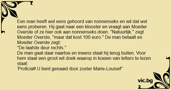 Een man heeft wel eens gehoord van nonnenseks en wil dat wel eens proberen. Hij gaat naar een klooster en vraagt aan Moeder Overste of ze hier ook aan nonnenseks doen. "Natuurlijk," zegt Moeder Overste, "maar dat kost 100 euro." De man betaalt en Moeder Overste zegt: