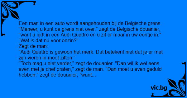 "Toch mag u niet verder," zegt de douanier. "Dan wil ik wel eens even met je chef praten," zegt de man. "Dan moet u even geduld hebben," zegt de douanier, "want m'n chef houdt net drie mensen in een Fiat Uno aan.