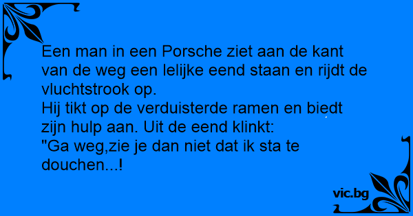 Een man in een Porsche ziet aan de kant van de weg een lelijke eend staan en rijdt de vluchtstrook op.