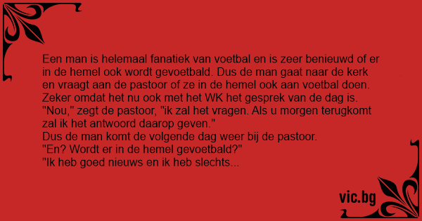 Er komt een man bij de pastoor en vraagt: 'Spelen ze in de hemel ook voetbal?' 'Dat weet ik niet,' zegt de pastoor: 'Ik heb vandaag pas de brochure aangevraagd. Kom over een week nog eens terug.'...