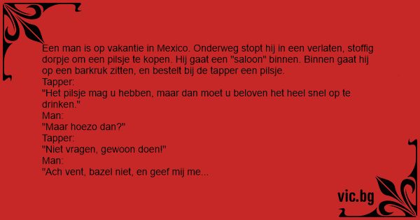 Een man is op vakantie in Mexico. Onderweg stopt hij in een verlaten, stoffig dorpje om een pilsje te kopen. Hij gaat een "saloon" binnen. Binnen gaat hij op een barkruk zitten, en bestelt bij de tapper een pilsje.