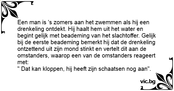 Een man is 's zomers aan het zwemmen als hij een drenkeling ontdekt. Hij haalt hem uit het water en begint gelijk met beademing van het slachtoffer. Gelijk bij de eerste beademing bemerkt hij dat de drenkeling ontzettend uit zijn mond stinkt en vertelt dit aan de omstanders, waarop een van de omstanders reageert met: " Dat kan kloppen, hij heeft zijn schaatsen nog aan".