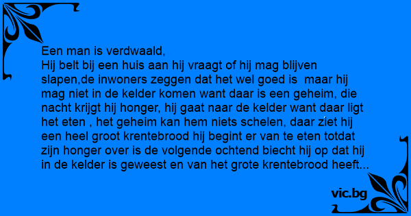 Hij belt bij een huis aan hij vraagt of hij mag blijven slapen,de inwoners zeggen dat het wel goed is maar hij mag niet in de kelder komen want daar is een geheim, die nacht krijgt hij honger, hij gaat naar de kelder want daar ligt het eten , het geheim kan hem niets schelen, daar ziet hij een heel groot krentebrood hij begint er van te eten totdat zijn honger over is de volgende ochtend biecht hij op dat hij in de kelder is geweest en van het grote krentebrood heeft gegeten, de boer en