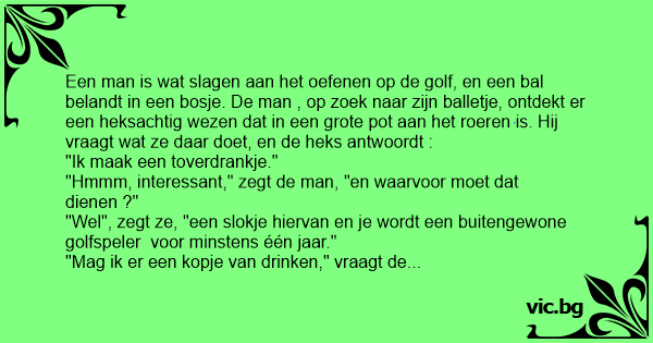 Zowat een jaartje later zoekt hij de heks terug op in hetzelfde bosje, en vertelt haar glunderend over zijn golftriomfen. "En," vraagt de heks," hое is het met je seksleven ? "