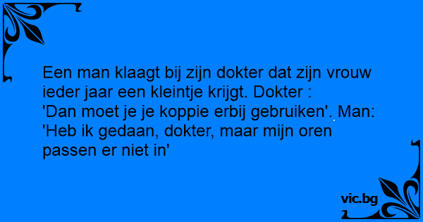 Een man klaagt bij zijn dokter dat zijn vrouw ieder jaar een kleintje krijgt. Dokter :