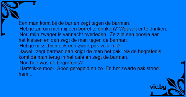 'Heb je zin om met mij een borrel te drinken?' Wat valt er te drinken. 'Nou mijn zwager is vannacht overleden.' Ze zijn een poosje aan het kletsen en dan zegt de man tegen de barman: