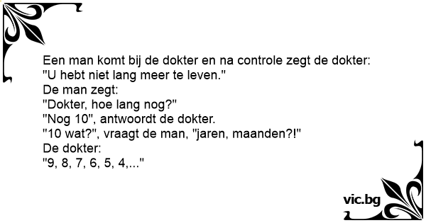Pasienten: Doktor, hvor lenge har jeg igjen? Doktoren: 10. Pasienten: 10 hva? Dager? Uker? Måneder? År? Doktoren: 9.. 8.. 7.. 6..