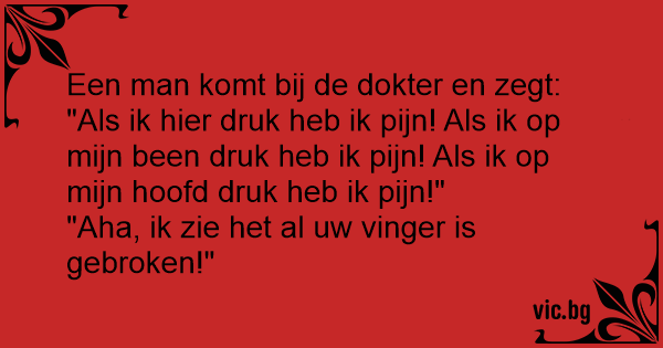 Er kwam een man bij een dokter, hij moest een momentje wachten in de wachtkamer. Toen hij aan de beurt was vertelde de man wat er aan de hand was “Wanneer ik mijn been aanraak heb ik pijn, wanneer...
