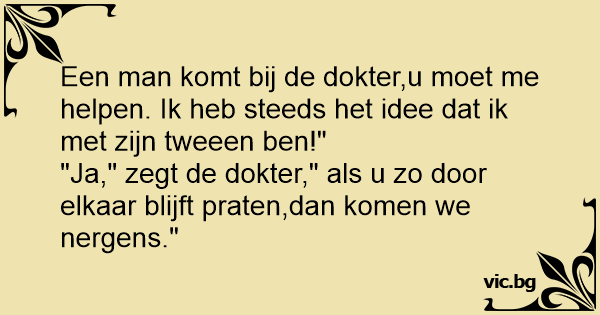 Een man komt bij de dokter,u moet me helpen. Ik heb steeds het idee dat ik met zijn tweeen ben!"