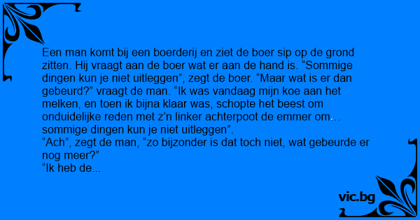 Een man komt bij een boerderij en ziet de boer sip op de grond zitten. Hij vraagt aan de boer wat er aan de hand is. “Sommige dingen kun je niet uitleggen”, zegt de boer. “Maar wat is er dan gebeurd?” vraagt de man. “Ik was vandaag mijn koe aan het melken, en toen ik bijna klaar was, schopte het beest om onduidelijke reden met z’n linker achterpoot de emmer om… sommige dingen kun je niet uitleggen”.