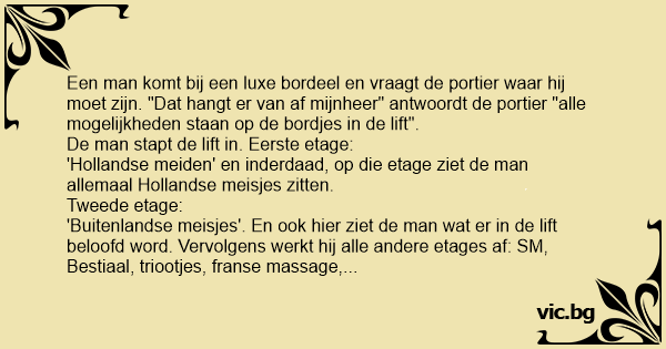 Een man komt bij een luxe bordeel en vraagt de portier waar hij moet zijn. "Dat hangt er van af mijnheer" antwoordt de portier "alle mogelijkheden staan op de bordjes in de lift".