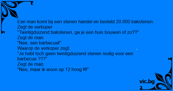 Een man komt bij een stenen handel en besteld 20.000 bakstenen. Zegt de verkoper: