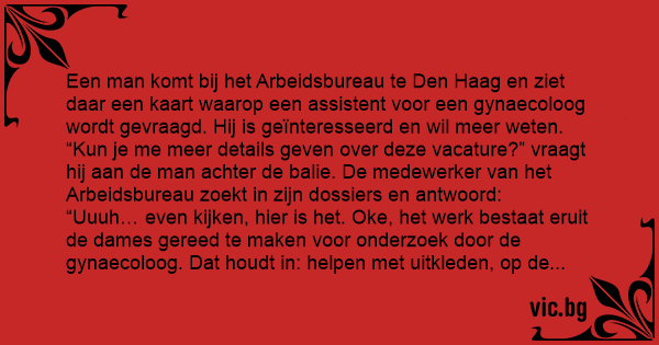 Een man komt bij het Arbeidsbureau te Den Haag en ziet daar een kaart waarop een assistent voor een gynaecoloog wordt gevraagd. Hij is geïnteresseerd en wil meer weten. “Kun je me meer details geven over deze vacature?” vraagt hij aan de man achter de balie. De medewerker van het Arbeidsbureau zoekt in zijn dossiers en antwoord: