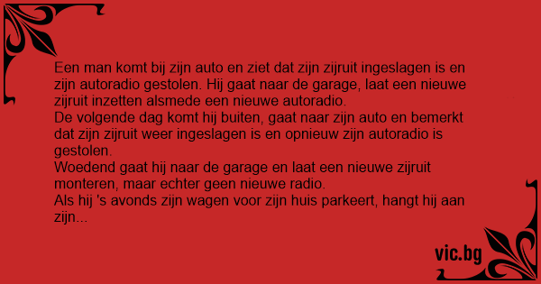 Een man komt bij zijn auto en ziet dat zijn zijruit ingeslagen is en zijn autoradio gestolen. Hij gaat naar de garage, laat een nieuwe zijruit inzetten alsmede een nieuwe autoradio.