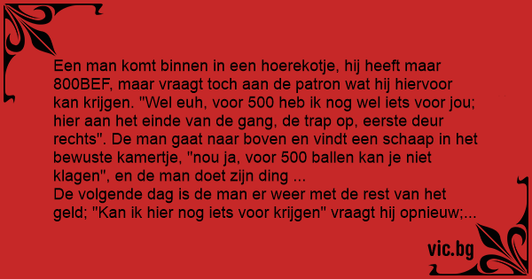 Een man komt binnen in een hoerekotje, hij heeft maar 800BEF, maar vraagt toch aan de patron wat hij hiervoor kan krijgen. "Wel euh, voor 500 heb ik nog wel iets voor jou; hier aan het einde van de gang, de trap op, eerste deur rechts". De man gaat naar boven en vindt een schaap in het bewuste kamertje, "nou ja, voor 500 ballen kan je niet klagen", en de man doet zijn ding ...