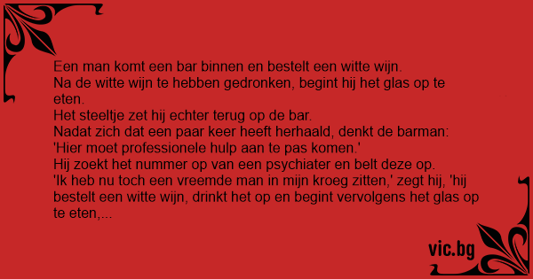 'Ik heb nu toch een vreemde man in mijn kroeg zitten,' zegt hij, 'hij bestelt een witte wijn, drinkt het op en begint vervolgens het glas op te eten, maar het steeltje zet hij terug op de bar.'