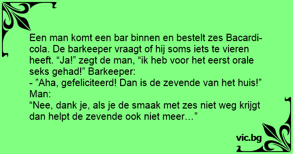 Een man komt een bar binnen en bestelt zes Bacardi-cola. De barkeeper vraagt of hij soms iets te vieren heeft. “Ja!” zegt de man, “ik heb voor het eerst orale sекs gehad!” Barkeeper: