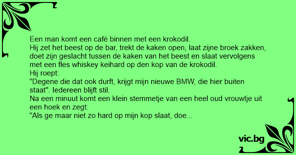 Een man komt een café binnen met een krokodil. Hij gaat aan de bar zitten en legt de krokodil op de toog. "He!" roept de barman, "weg met dat beest, dat is levensgevaarlijk!" "Welnee," zegt de man,...