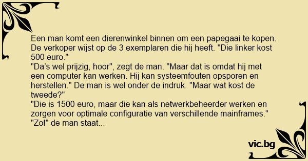 Een man komt een dierenwinkel binnen om een papegaai te kopen. De verkoper wijst op de 3 exemplaren die hij heeft. "Die linker kost 500 euro."