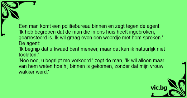 'Nee nee, u begrijpt me verkeerd.' zegt de man, 'Ik wil alleen maar van hem weten hое hij binnen is gekomen, zonder dat mijn vrouw wakker werd.'