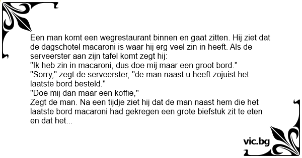 Zegt de man. Na een tijdje ziet hij dat de man naast hem die het laatste bord macaroni had gekregen een grote biefstuk zit te eten en dat het bord met macaroni onaangeroerd naast hem staat. Hij vraagt: