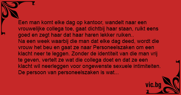 Een man gaat op een dag naar een collega van het kantoor, hij gaat heel dicht bij Haar staan, haalt diep adem en zegt: Wat ruikt je haar lekker! De volgende dag gebeurt hetzelfde, de man gaat...
