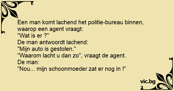 Een man komt lachend het politie-bureau binnen, waarop een agent vraagt: