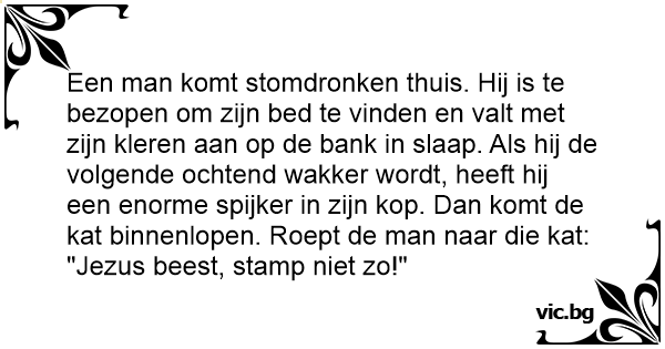 Een man komt stomdronken thuis. Hij is te bezopen om zijn bed te vinden en valt met zijn kleren aan op de bank in slaap. Als hij de volgende ochtend wakker wordt, heeft hij een enorme spijker in zijn кор. Dan komt de kat binnenlopen. Roept de man naar die kat: