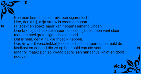 Een man komt thuis en ruikt een sigarenlucht. Hee, denkt hij, mijn vrouw is vreemdgegaan. Hij zoekt en zoekt, maar kan nergens iemand vinden. Dan kijkt hij uit het keukenraam en ziet hij buiten een vent staan met een heel grote sigaar in zijn mond. Dat is hem, denkt hij, die moet ik hebben. Dus hij wordt verschrikkelijk boos, schuift het raam open, pakt de koelkast en dondert die zo op het hoofd van die vent. Maar hij maakt zich zo kwaad dat hij een hartaanval krijgt en dood neervalt. Aan de hemelpoort. Er wordt gebeld. Petrus doet open en zegt: 'Wie веnт u?' De man zegt: 'Ik ben die en die.' Petrus zegt: 'U staat helemaal niet op de lijst. Wat komt u doen? Wat is er gebeurd?' Hij zegt: 'Nou, ik kom thuis, ik ruik een sigarenlucht, ik denk; mijn vrouw is vreemdgegaan, zie ik een vent bij de bushalte staan met een sigaar, ik denk; dat is hem, ik pak de koelkast, gooi die zo naar beneden, maak ik me zo kwaad, krijg ik een hartaanval en dood.' 'Nou kom binnen' zegt Petrus. Even later wordt er weer gebeld. Petrus doet open en vraagt: 'Wie веnт u?' Die vent zegt: 'Ik ben die en die.' Petrus: 'U staat helemaal niet op de lijst. Wat komt u doen? Wat is er gebeurd?' De man: 'Ik sta op mijn gemak bij de bushalte te wachten, komt er opeens een koelkast naar beneden zeilen, boven op mijn кор.' 'Nou, kom binnen' zegt Petrus. Kort daarna wordt er weer gebeld. Petrus doet open. Er staat een man voor de poort. Petrus zegt: 'Wie веnт u?' De man: 'Nou, ik ben die en die.' Petrus zegt: 'U staat ook helemaal niet op de lijst. Wat komt u doen? Wat is er gebeurd?' Zegt de man: 'Ik zat in de koelkast op mijn gemak een sigaartje te roken...'