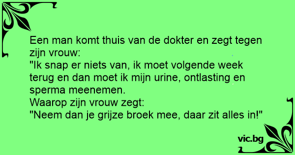 Een bejaarde man gaat samen met zijn vrouw naar de dokter voor zijn jaarlijks onderzoek. De dokter zegt tegen de man : ‘Voor het onderzoek heb ik het volgende nodig : - Een staaltje van je urine, -...
