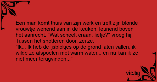 Een man komt thuis van zijn werk en treft zijn blonde vrouwtje wenend aan in de keuken, leunend boven het aanrecht. "Wat scheelt eraan, liefje?" vroeg hij. Tussen het snotteren door, zei ze: