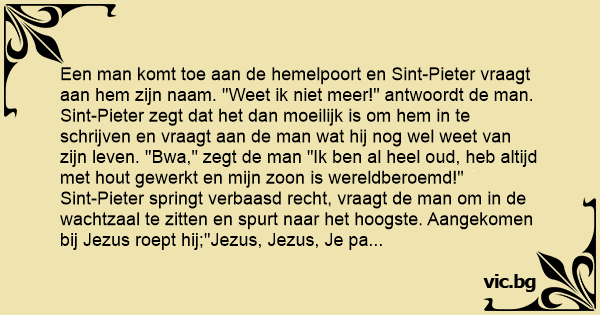 Een man komt toe aan de hemelpoort en Sint-Pieter vraagt aan hem zijn naam. "Weet ik niet meer!" antwoordt de man. Sint-Pieter zegt dat het dan moeilijk is om hem in te schrijven en vraagt aan de man wat hij nog wel weet van zijn leven. "Bwa," zegt de man "Ik ben al heel oud, heb altijd met hout gewerkt en mijn zoon is wereldberoemd!"