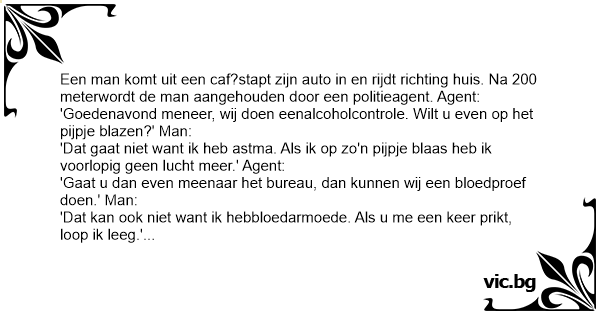 'Goedenavond meneer, wij doen eenalcoholcontrole. Wilt u even op het pijpje blazen?' Man: