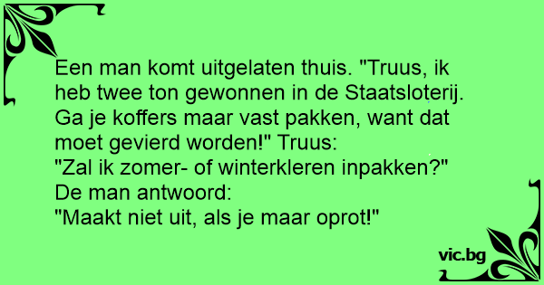 Een man heeft een jackpot gewonnen en gaat helemaal opgewonden naar huis. “Truus, pak je koffers maar in” zegt de man. “Wat is er dan aan de hand?” vraagt zijn vrouw. “Ik heb 2 miljoen gewonnen met...