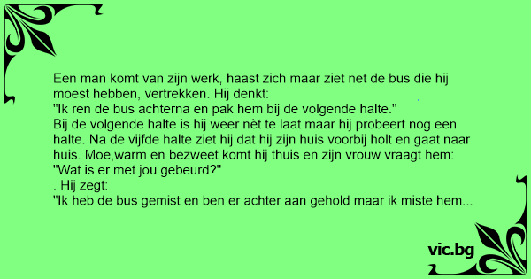 Bij de volgende halte is hij weer nèt te laat maar hij probeert nog een halte. Na de vijfde halte ziet hij dat hij zijn huis voorbij holt en gaat naar huis. Moe,warm en bezweet komt hij thuis en zijn vrouw vraagt hem: